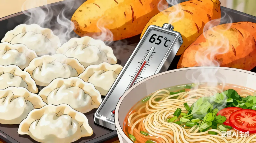 刚出锅的饺子、汤圆,中心温度可达75~85℃,且因外皮隔热,散热缓慢。