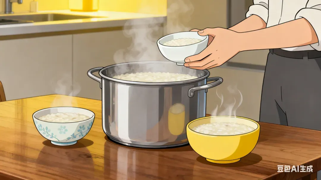 热粥/面条分装小碗、稍搅动,可促进热对流