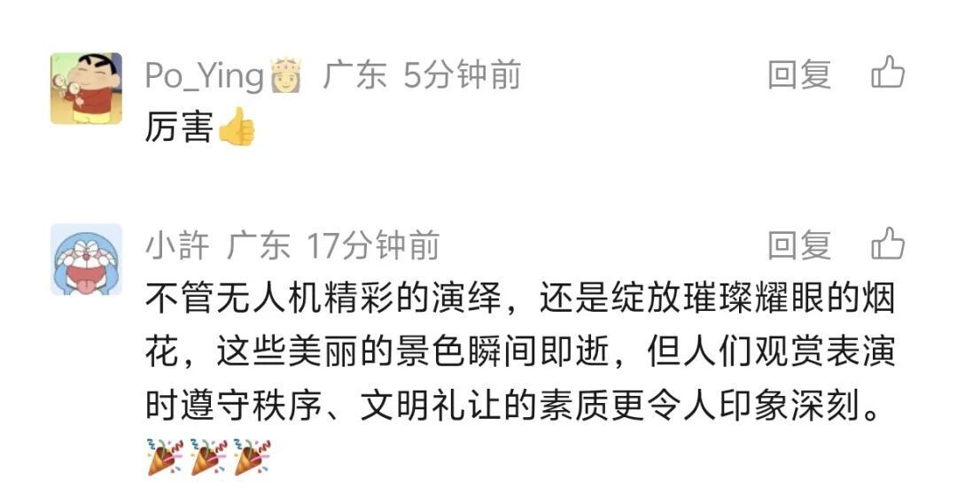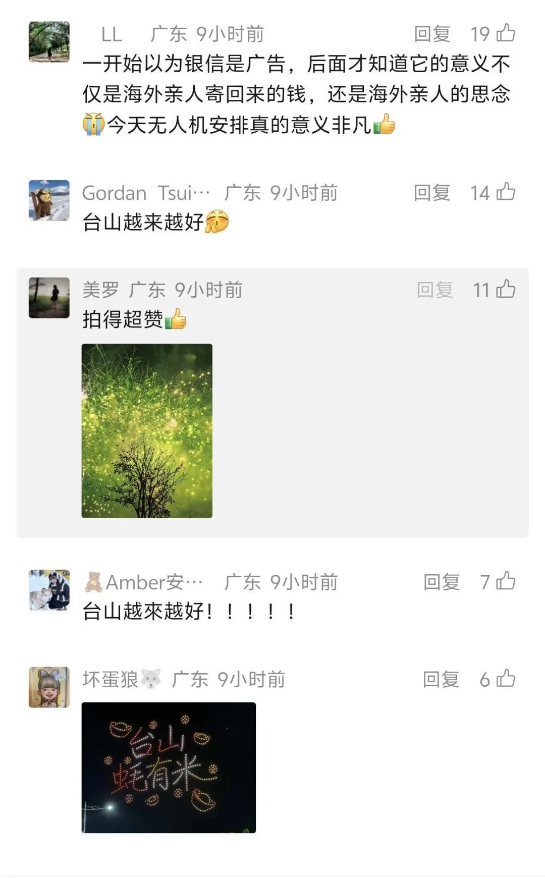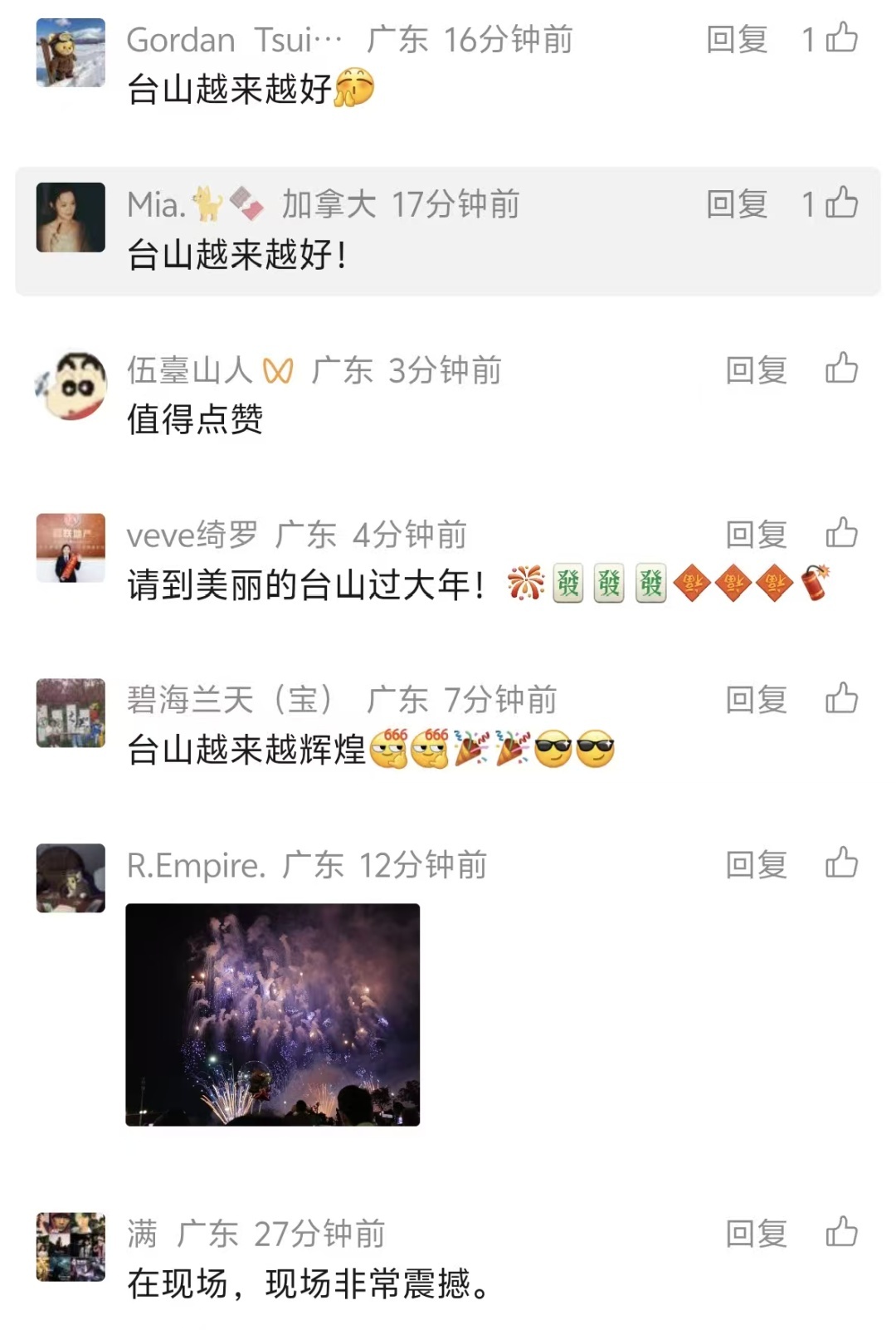现场市民、务工人员、海外侨胞纷纷为台山新春氛围点赞。市民曾凤娇表示,丈夫在台山务工,自己特意带孩子从老家来台山团圆过年,“今晚的烟花汇演太震撼了,我们特别激动,尤其是无人机表演展示了丰富的台山本土特色文化,真切感受到台山城市发展的魅力。”