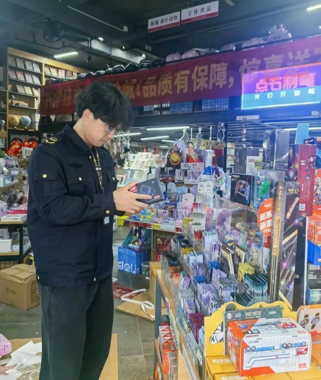 此次专项检查以中小学周边的文具店、超市、便利店为重点区域。货架上,执法人员翻看每一类学生高频使用的文具——书写笔、橡皮擦、修正带、课业簿册,逐一核对标签上的厂名厂址、执行标准、生产日期。“三无”产品、无3C认证玩具、标识不规范商品,见一件、清一件,不让问题文具流入学生手中。
