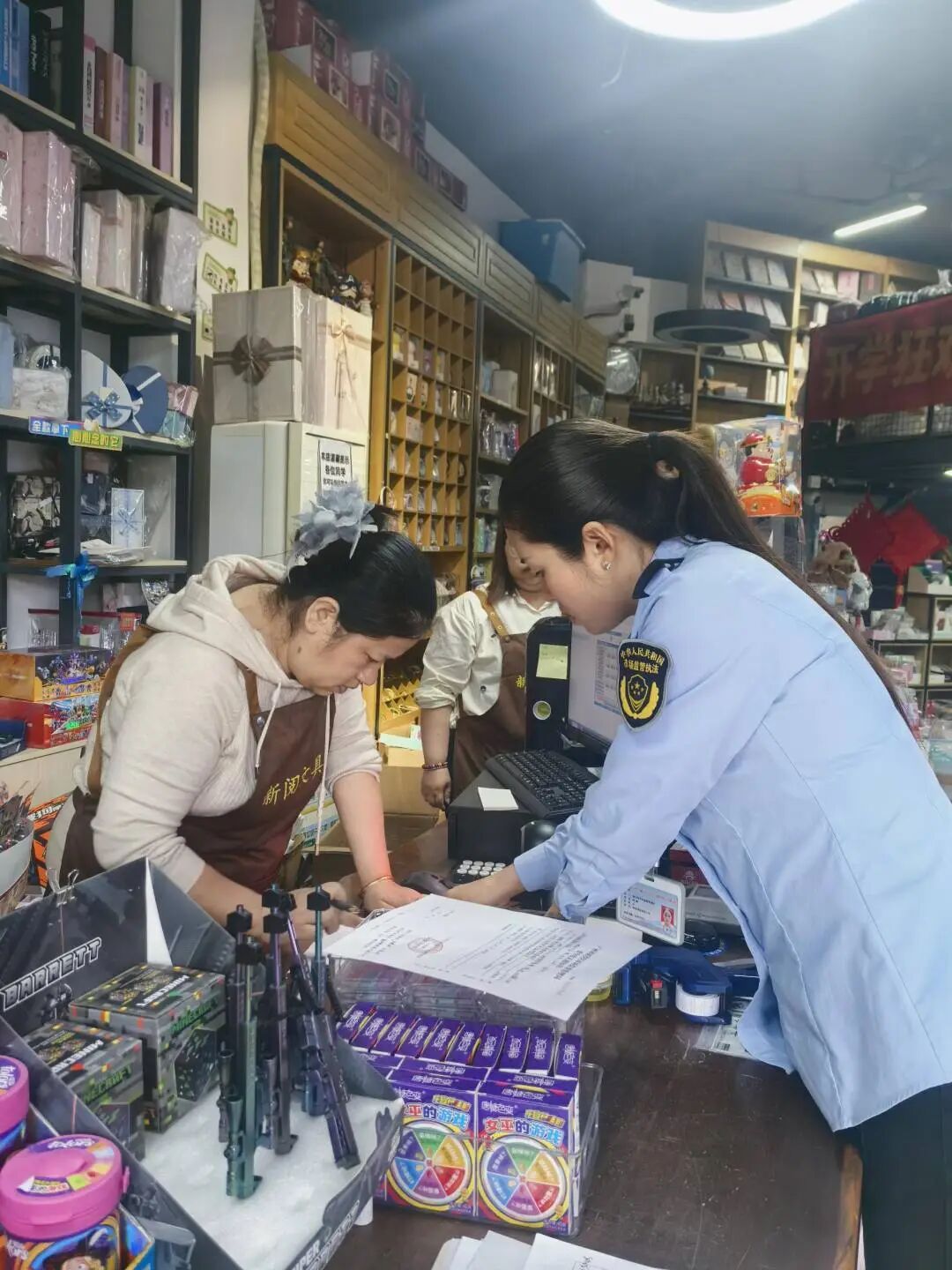 营业执照挂在哪里,执法人员的眼睛就跟到哪里。取下证照,逐一核对经营范围——有没有超范围销售玩具?是否需要前置审批资质?证照是否在有效期内、信息有无变更?发现问题的,当场提醒、督促办理。亮照亮证、合规经营,这道底线一步不让。